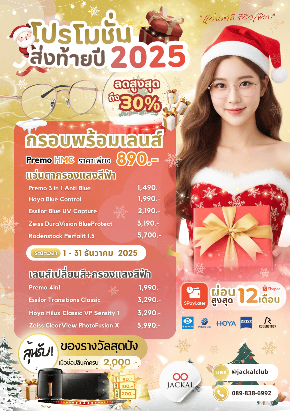 โปรโมชั่นสุดพิเศษนี้มีตลอด เดือนธันวาคม 2568 เท่านั้น! มาที่ ร้านแว่นตา Jackal เชียงใหม่ เพื่อรับสิทธิ์ก่อนใคร แล้วให้ดวงตาของคุณได้สัมผัสกับความคมชัดและสไตล์ที่ลงตัว