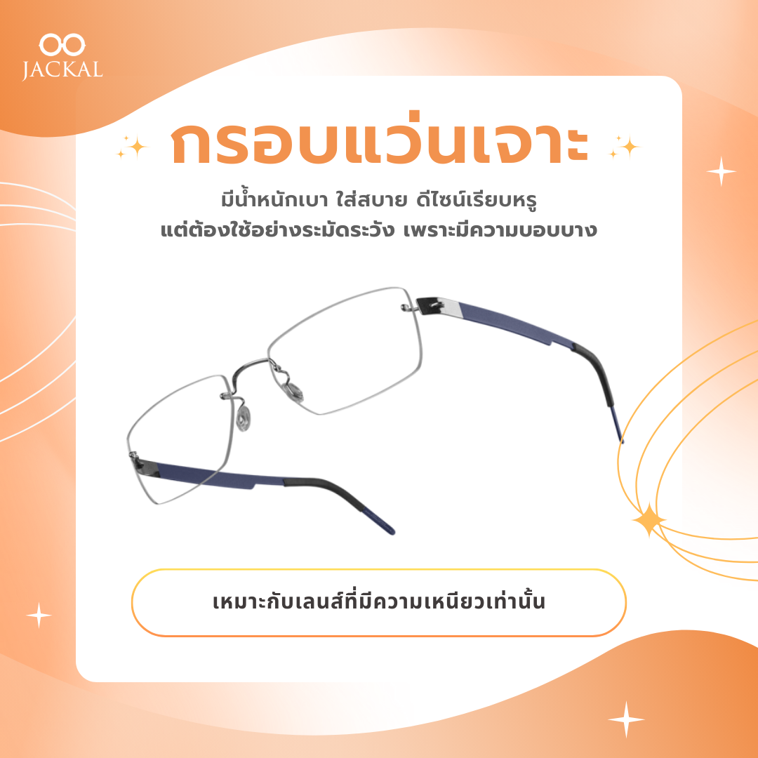 กรอบเจาะ หรือ Rimless Frame จะไม่มีกรอบแว่นหุ้มเลนส์อยู่เลย แต่จะยึดขาแว่นติดไว้ที่เลนส์ ทำให้ได้แว่นสายตาที่น้ำหนักเบาและดูหรูหรา นอกจากนี้ยังได้อิสระในการออกแบบให้เข้ากับรูปหน้ามากยิ่งขึ้น แต่จะเหมาะกับเลนส์แว่นแบบเนื้อเหนียวหรือเลนส์ Polycarbonate เท่านั้น เพราะจะมีความแข็งแรงกว่า ทำให้เลนส์ไม่แตกเสียหายง่าย